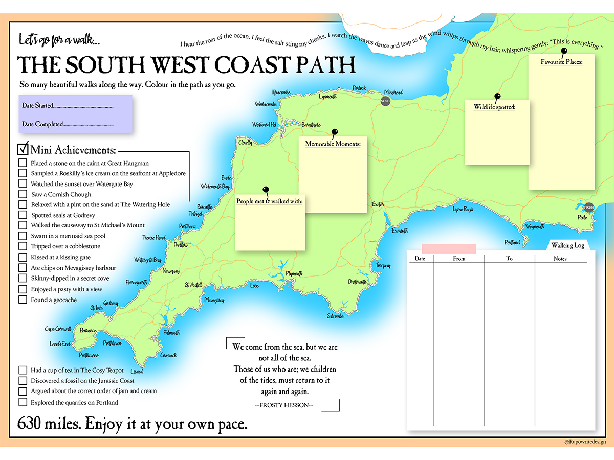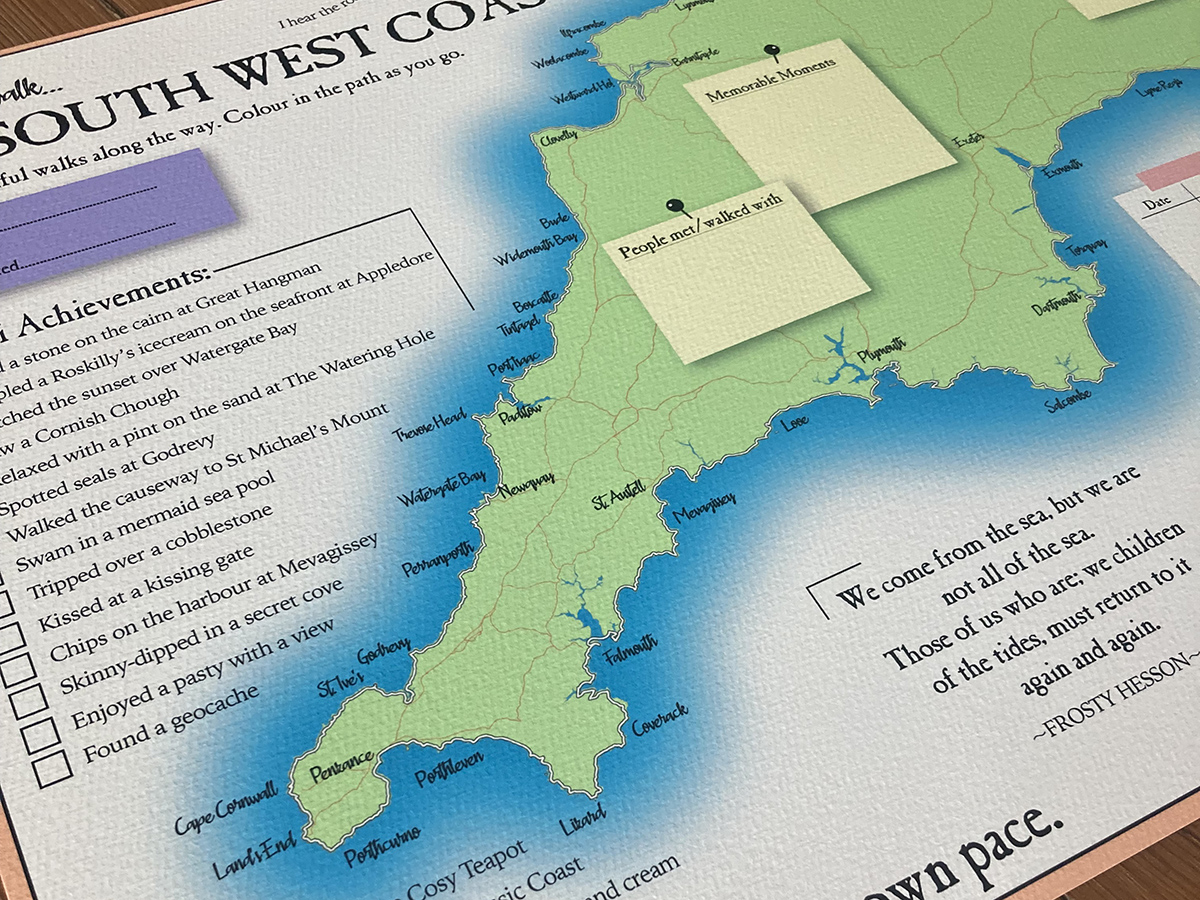 Both detail the entire path, with a hollow line that can be coloured as you go. There is space to note down the dates and locations of your walks, as well as places to record special memories and things you spotted along the way. And just for fun, a great little check-list you can mark off as you achieve such milestones as ‘tripped over a cobblestone’, and ‘spotted the seals at Godrevy’.