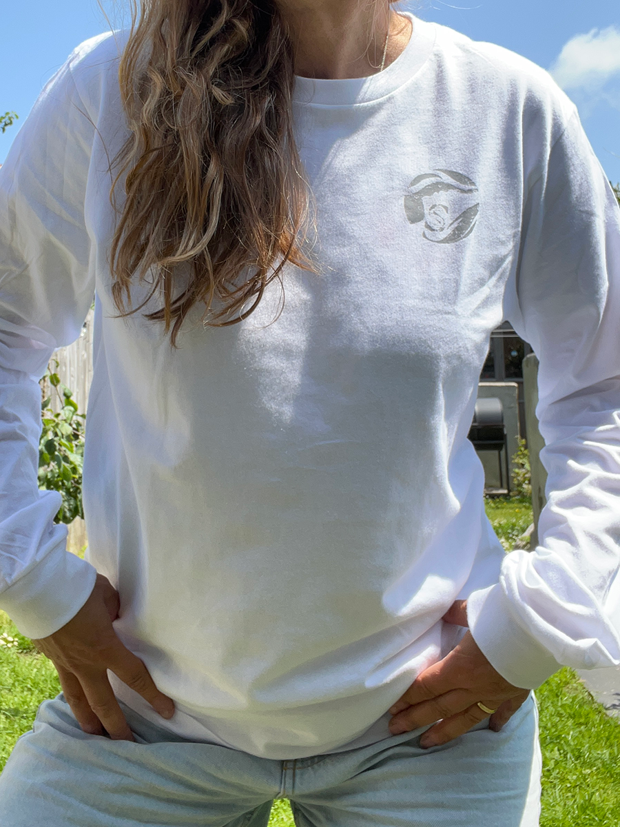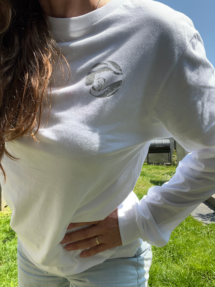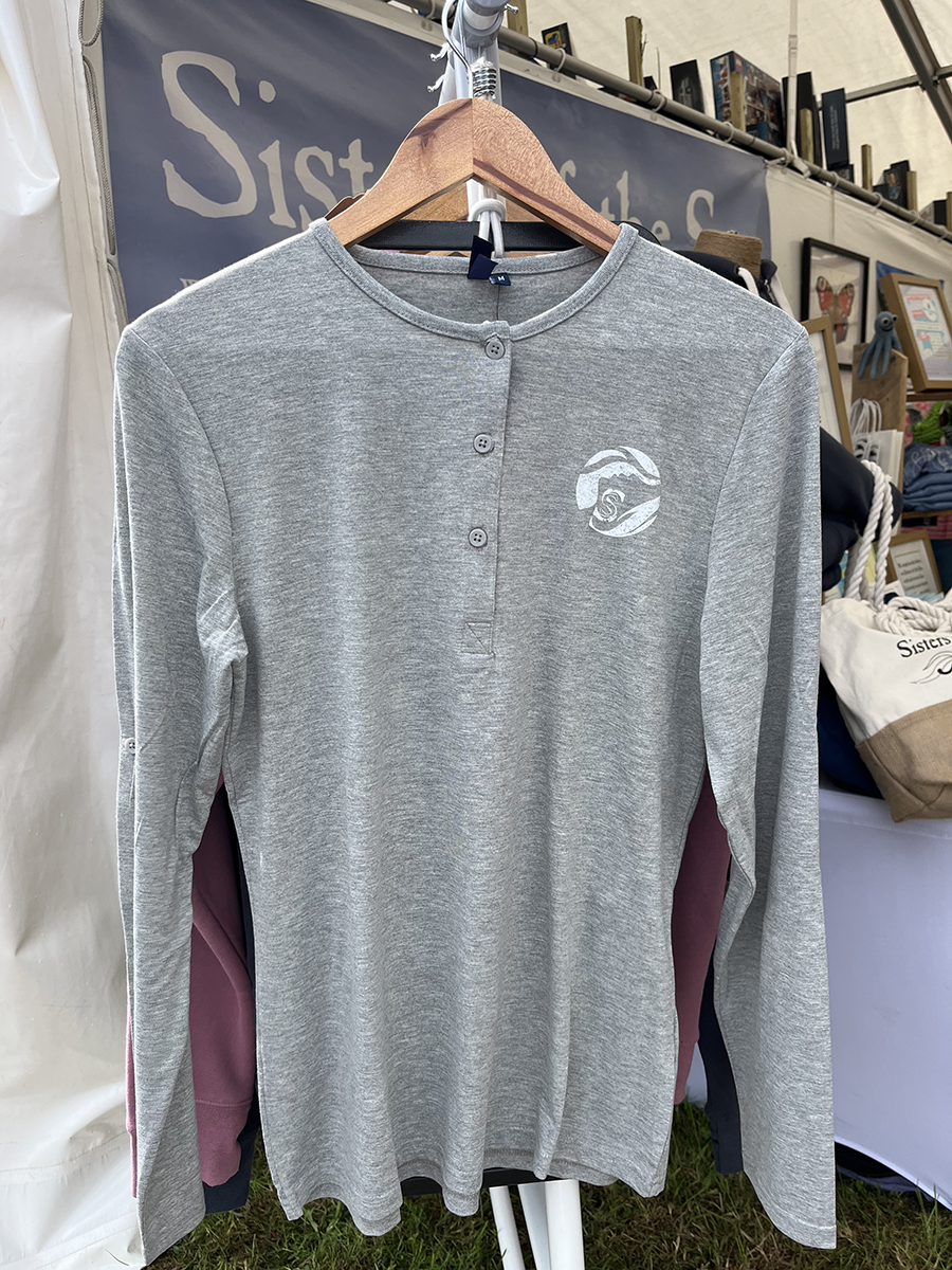 The Sisters of the Sea throw-on long sleeve top features the gorgeous new Love Waves design across the back and the signature logo on the chest. Available in either simple white with a chic grey print, or a Henley style grey with white print and roll-up sleeves, they are made from the same beautiful soft cotton as our t-shirts – the perfect summer throw-on for cooler days.